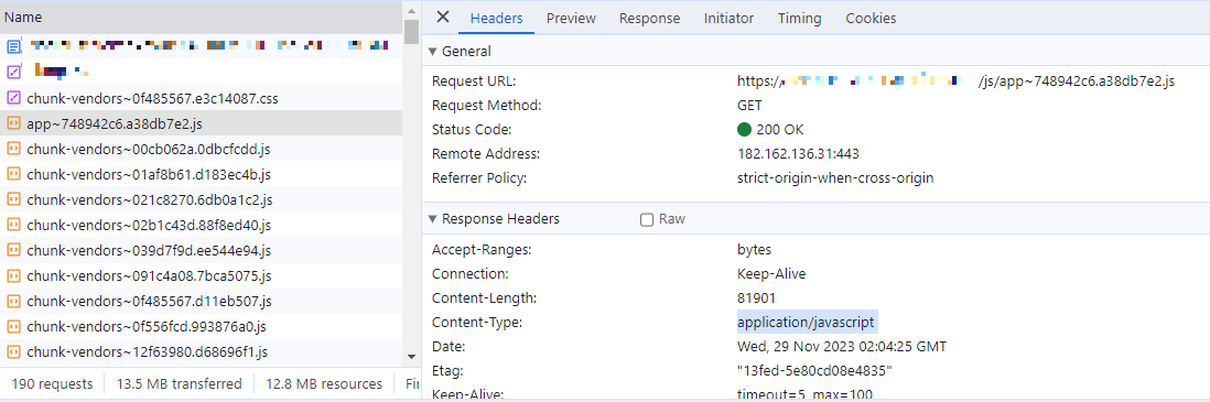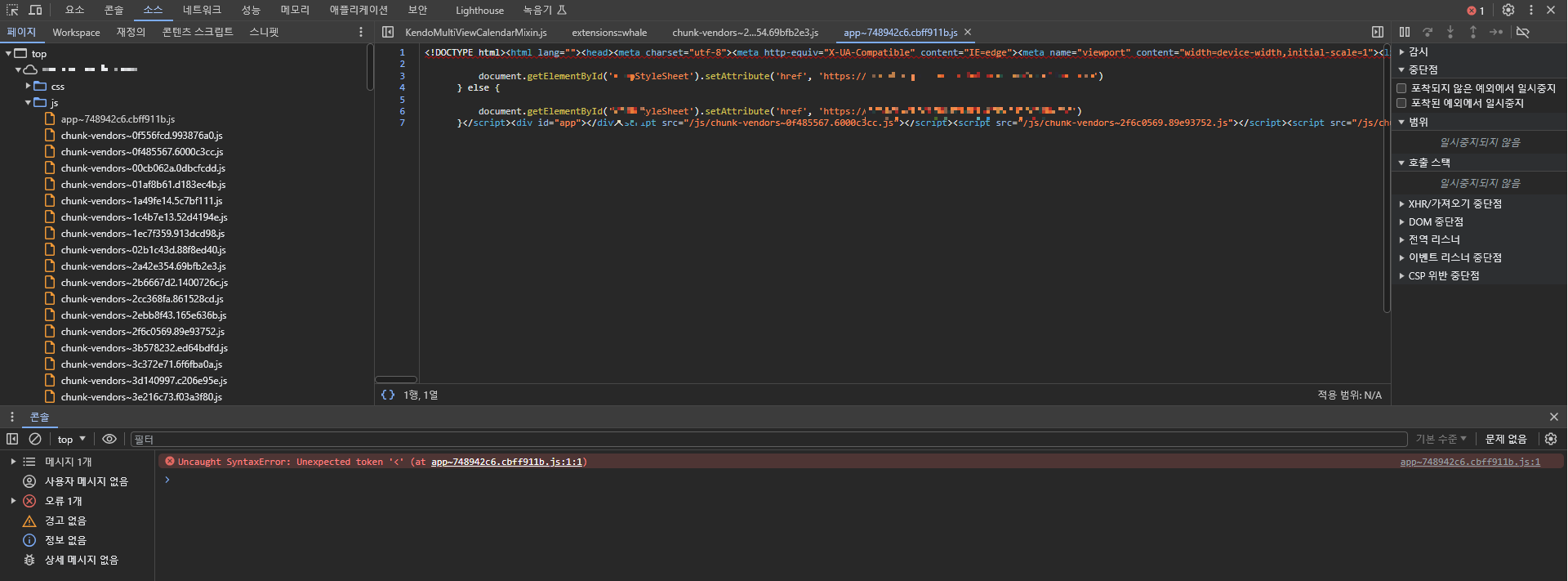 Vuejs로 구현된 SPA 환경이고, 브라우저에서 도메인 접속 시도하면 화면이 뜨지 않고 console 오류가 발생된다.